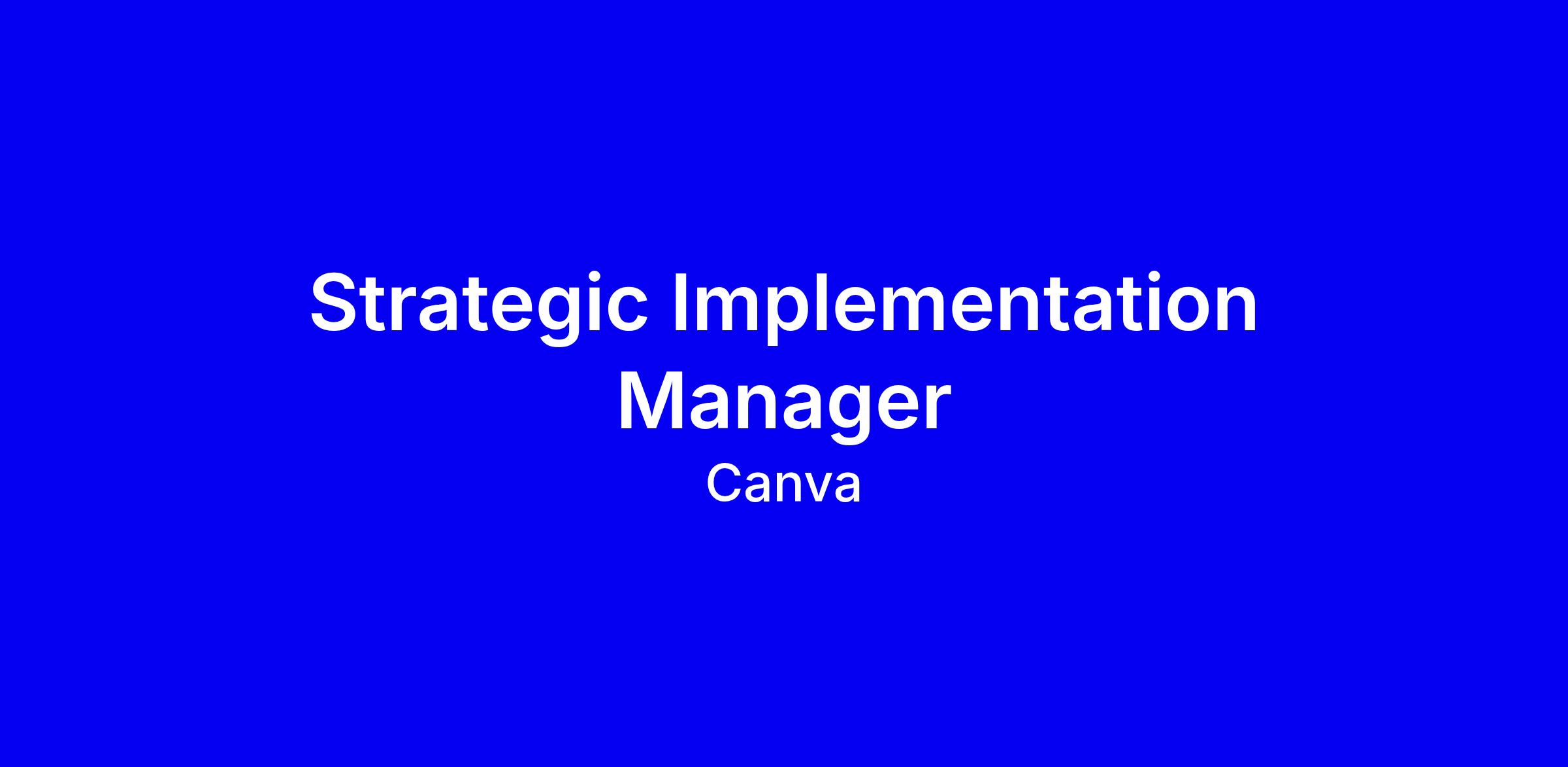 Canva is seeking a Strategic Implementation Manager to join the Global Implementation team in San Francisco for a 3 to 4 month engagement with enterprise and strategic customers. You’ll become a Canva product expert within 30 days, design tailored rollout frameworks, drive timelines and adoption, co build implementation processes, and collaborate with Customer Education and Product to improve the help center and overall product experience. The ideal candidate has 5+ years delivering SaaS or enterprise software implementations for multi region clients, strong strategic project management and stakeholder management skills, and thrives in a fast paced setting. To apply, tailor your resume with measurable outcomes, emphasize executive relationships and client success, include pronouns, note virtual interviews, and expect a salary range of 161k to 206k plus equity and benefits. Onsite in San Francisco with flexible options.