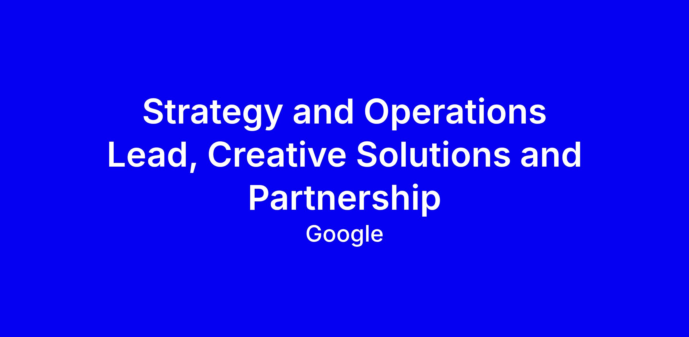 Google seeks a Strategy and Operations Lead for Creative Solutions and Partnerships, onsite in Singapore, within Google's Ads Go-to-Market Operations, to accelerate YouTube growth. The role requires a bachelor’s degree and at least six years in Product Strategy, Operations, Sales, a creative agency, or Marketing. You will be the regional expert for creative solutions and partnerships, identify and execute GTM strategies, and design activation programs including thought leadership and enablement. You’ll influence executive product and sales leaders, collaborate with Specialists and Sales leads to unlock big bets, and remove blockers. To apply, show cross-functional impact on complex launches, quantify outcomes with advertisers and agencies, demonstrate communication and relationship-building, and tailor a concise cover letter linking your background to Google's APAC priorities for YouTube growth.