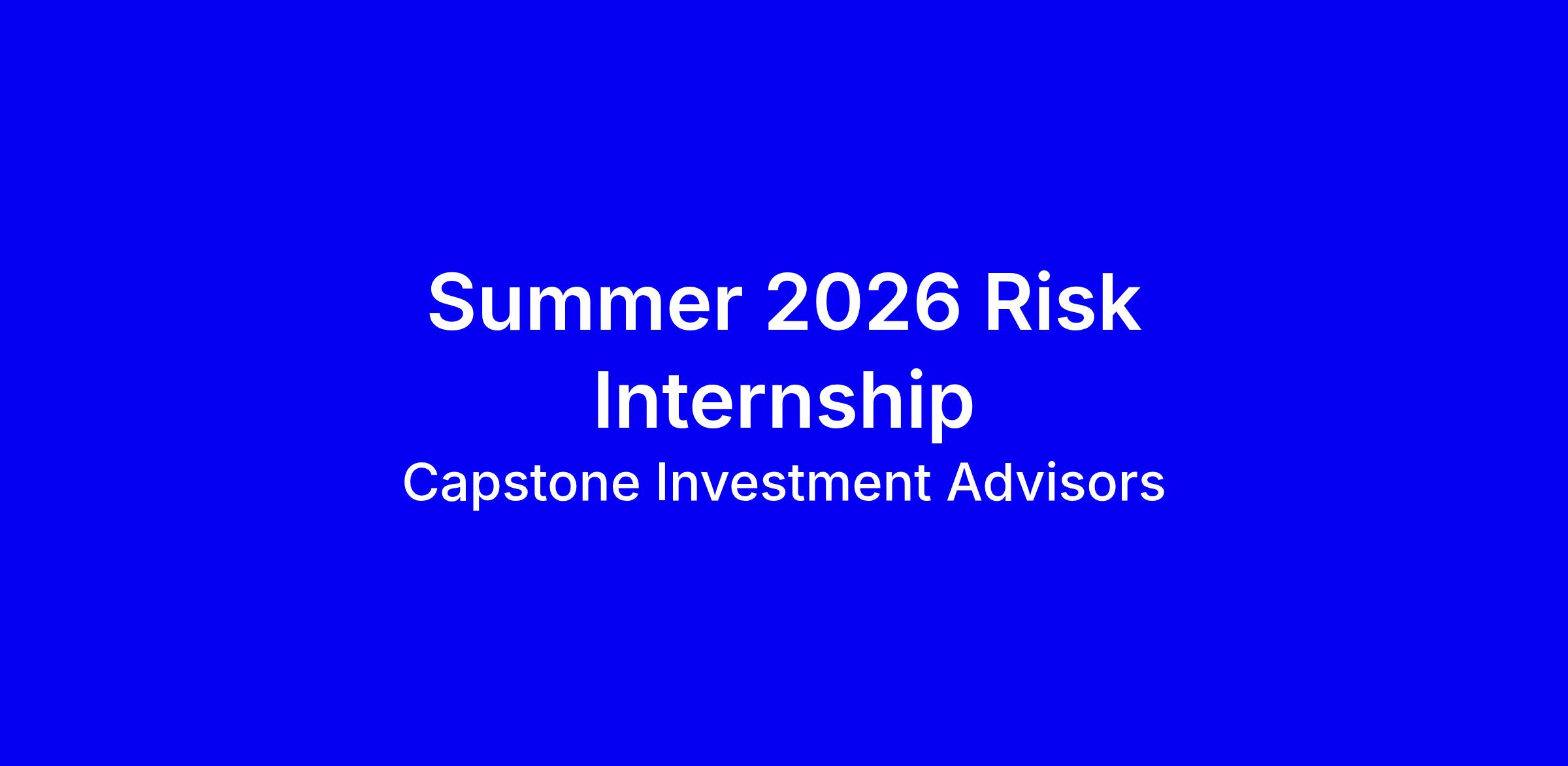 Capstone Investment Advisors is seeking a Summer 2026 Risk Intern for an onsite role in London, with placements in Risk Technology or the Risk team. The Risk Management Team measures, monitors and manages risk across all asset classes, working closely with trading and technology to build tools and analytics. Ideal candidates are current undergraduates or master’s students graduating in 2026 or 2027, in Mathematics, Financial Engineering, Computer Science or related fields, with strong Excel and hands on Python or Java experience, including Pandas, NumPy, sklearn or Dash. Bonus: familiarity with machine learning. In your application, highlight risk analytics projects, coding experience, teamwork, and a demonstrated curiosity about technology and AI. Apply via the Capstone Careers page and follow Capstone on LinkedIn.