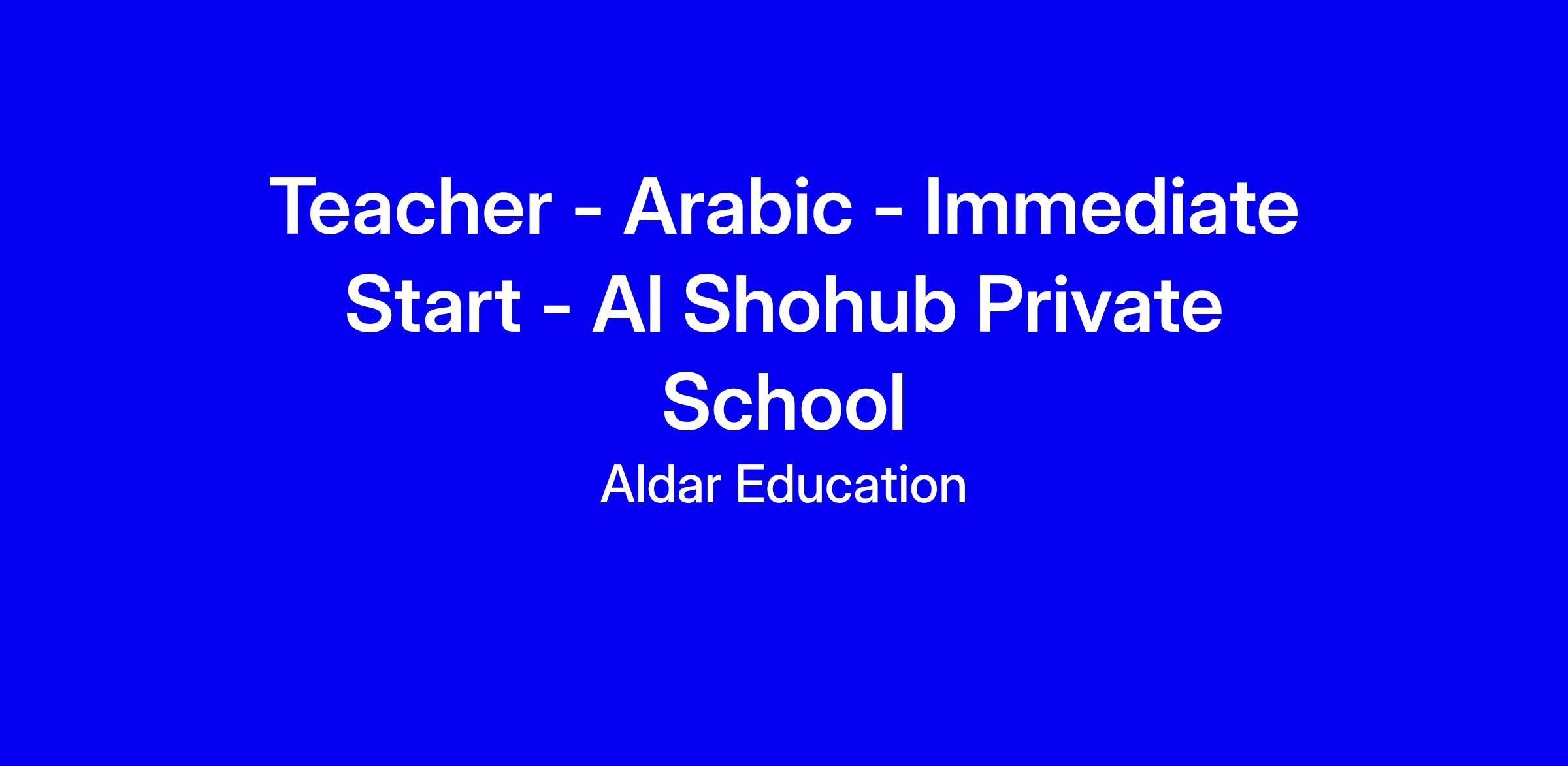 Aldar Education are currently seeking a Teacher - Arabic (Immediate Start) for Al Shohub Private School to support our growing family of owned and operated schools in the UAE.