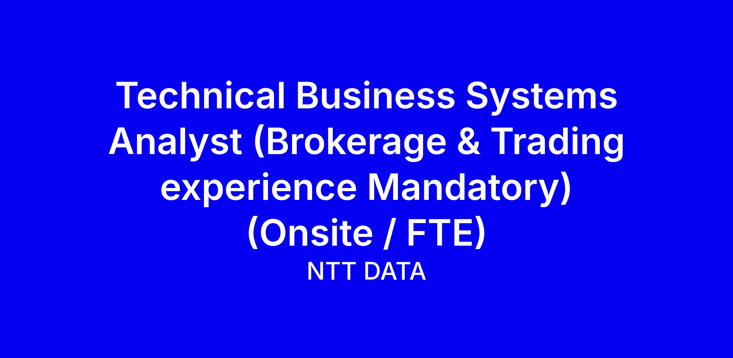 NTT DATA is seeking a Technical Business Systems Analyst with mandatory Brokerage and Trading experience to join our Westlake, Texas team on a full-time onsite basis. You will contribute to cross-functional squad efforts around platform modernization, ensure system integration and business alignment, and translate business needs into technical requirements for Angular, TypeScript and Java Spring initiatives while supporting end-to-end delivery from requirements validation to production readiness. The role requires 5+ years as a systems analyst, brokerage trading familiarity, strong SQL and API (REST, SOAP) skills, Agile experience, and proven ability to write user stories and specifications. Tips for applying include tailoring your resume to brokerage projects, quantifying impact, highlighting collaboration with UX designers and tools like Figma, and demonstrating a proactive, quality-driven delivery mindset.