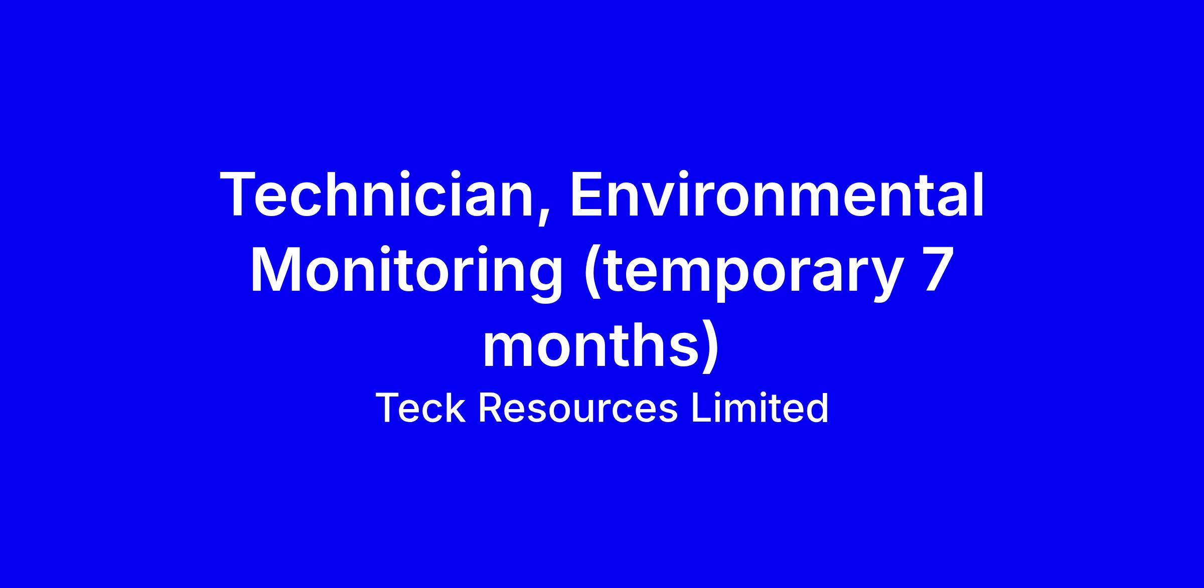 Reporting to the Group Leader, Environmental Monitoring, the Technician, Environmental Monitoring - temporary provides reliable, quality assured environmental data to Teck Metals Ltd. for government agencies and other external parties.