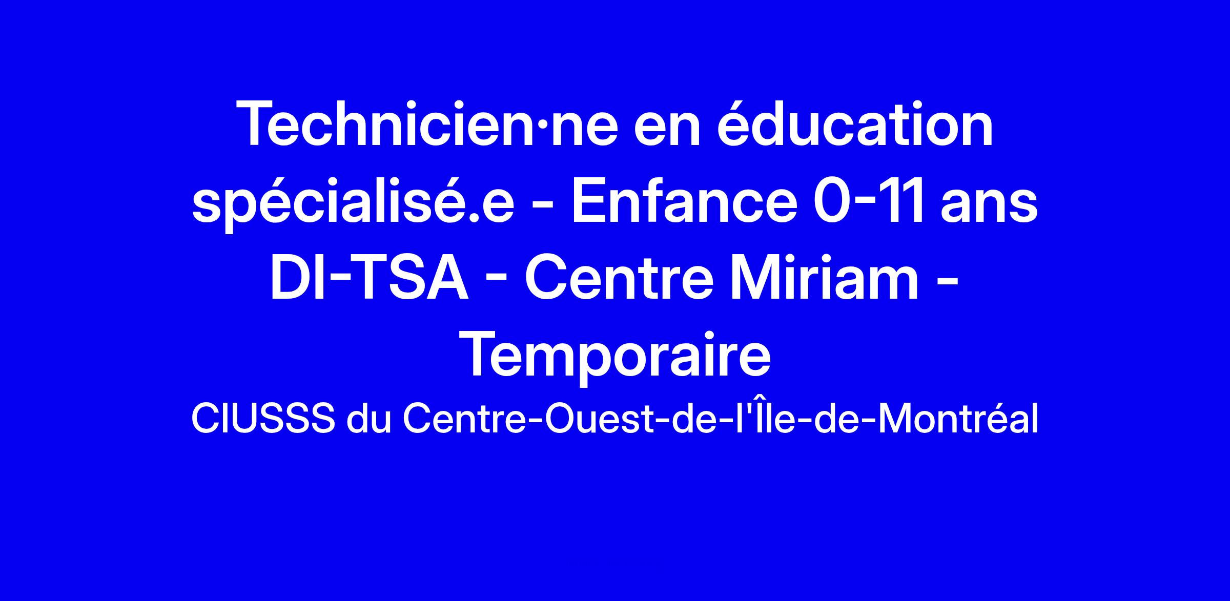 Ce poste de technicien(ne) en éducation spécialisée, Enfance 0-11 ans DI-TSA, au Centre Miriam, est une opportunité temporaire au sein d'une équipe interdisciplinaire. Vous accueillerez et évaluerez les enfants, fixerez des objectifs, concevrez et mettrez en œuvre les interventions, coordonnerez les actions avec les partenaires et assurerez la documentation des évaluations et rapports. Pour postuler, privilégiez une DEC en techniques d’éducation spécialisée et au moins six mois d’expérience DI TSA; le bilinguisme, la maîtrise d’Office et de Sipad sont des atouts. Mettez en valeur votre esprit d’analyse, votre sens du travail d’équipe et votre capacité à former les autres. Mentionnez votre disponibilité jusqu’en mars 2026 et l’inclusion. Pour les mesures d’adaptation, contactez le service recrutement.