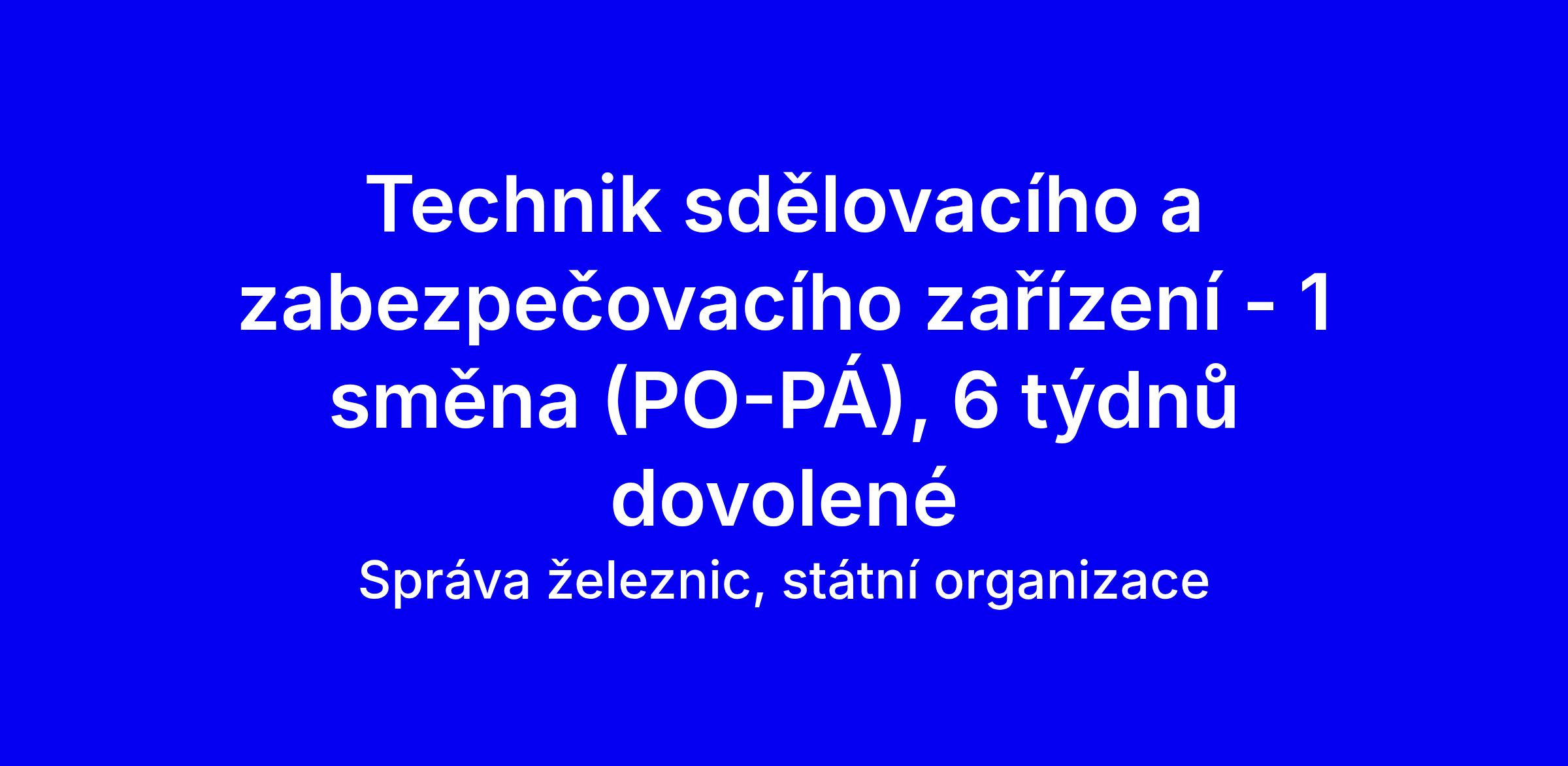Pozice technik sdělovacího a zabezpečovacího zařízení ve Správě železnic nabízí stabilní, smysluplnou práci s viditelným dopadem na bezpečný a plynulý provoz železnice. Požadujeme vyučení nebo středoškolské vzdělání v oboru elektro, ochotu pracovat ve výškách, zdravotní způsobilost k práci na doprovázené dopravní cestě, řidičský průkaz sk B a spolehlivost. Budete se starat o provoz systémů na tratích i ve stanicích, diagnostikovat a provádět údržbu a zapojovat se do dozoru při rekonstrukcích. Nabízíme 6 týdnů dovolené, jednosměnnou práci PO-PÁ, náborový příspěvek 150 000 Kč (nebo 100 000 Kč bez vyhlášky), prohlídku pracoviště před podpisem smlouvy a širokou nabídku benefitů. Pracoviště Roudnice nad Labem. Kontakt: Nikola Benešová, [email protected], +420 725 335 447.