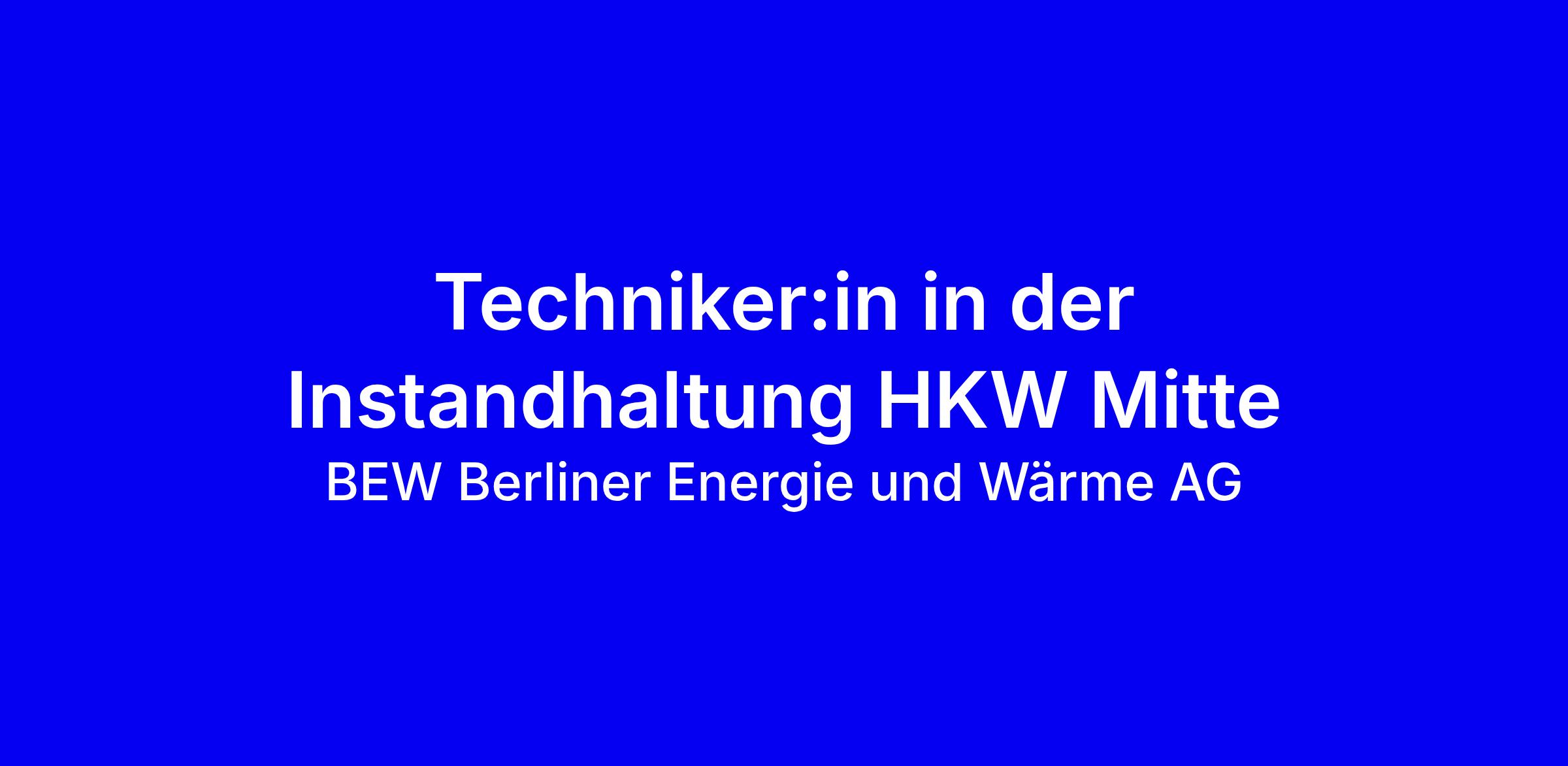 Für die BEW Berliner Energie und Wärme GmbH suchen wir Dich zum nächstmöglichen Zeitpunkt als Techniker:in in der Instandhaltung am Standort HKW Mitte (Berlin) in unbefristeter Anstellung.