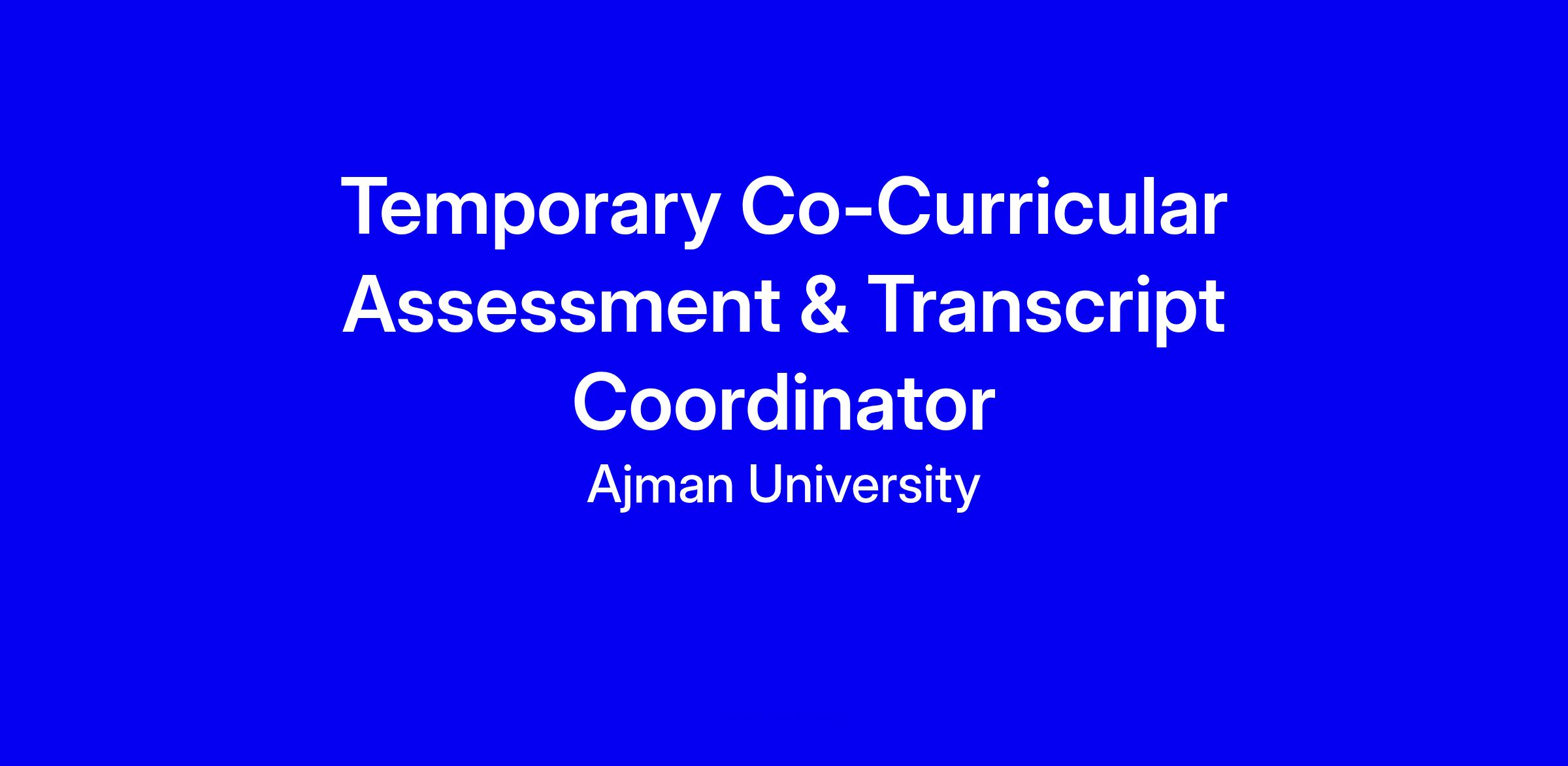 The Co-Curricular Assessment & Transcript Coordinator will play a pivotal role in developing, implementing, and managing the University’s Co-Curricular Transcript and the systematic assessment of all co-curricular activities. This role directly contributes to advancing Ajman University’s mission by ensuring that student development initiatives are recognized, documented, and aligned with the University’s Institutional Learning Outcomes (ILOs) . In addition , the cucuricular activities transcript will support students' employability. The position requires strong coordination, communication, and analytical skills to manage multi-stakeholder engagement across faculties, units, and administrative offices.