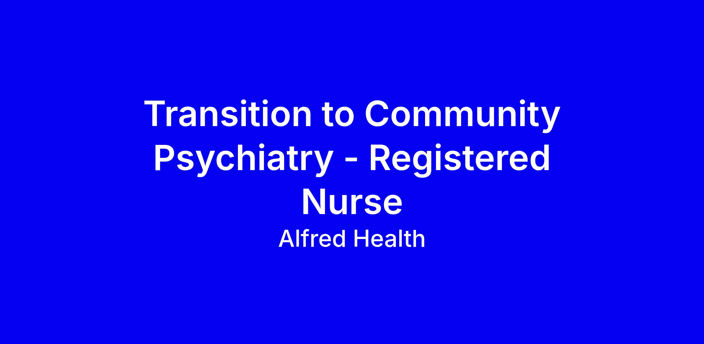 Alfred Health's Bayside Health is seeking a Registered Nurse to join the 12-month Transition to Specialist Community Psychiatry program at St Kilda Road Community Mental Health Services. This full-time fixed-term role supports nurses moving from inpatient units into community mental health, with protected time, a capped caseload, and mentorship, education and clinical supervision. You'll develop specialist community mental health nursing skills, advanced assessment, family consultation and psychosocial interventions within a multidisciplinary team focused on recovery, rehabilitation and trauma-informed care. To apply, click APPLY and attach your resume and a tailored cover letter highlighting your inpatient experience and readiness for community work. For questions contact Val Grueva; applications close 11pm AEDT, Monday 9 March 2026. We encourage applicants from diverse backgrounds.