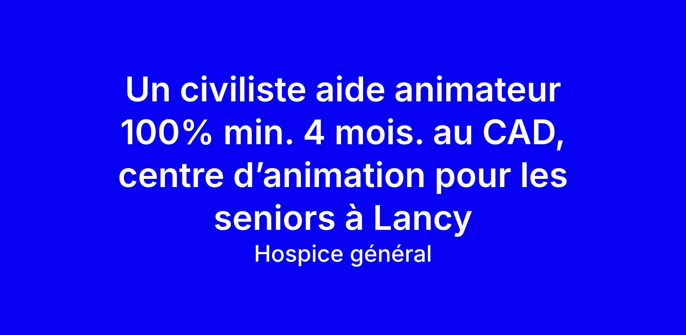 Cette offre propose un poste de civiliste aide animateur 100% pour une durée de 4 à 6 mois au CAD, centre d’animation pour seniors du Grand-Lancy, rattaché à l’Hospice général. Vous assisterez l’animateur socioculturel dans les activités collectives et individuelles, accueillerez les participants, favoriserez la vie sociale des seniors et assurerez l’achat et l’entretien du matériel, avec une collaboration ponctuelle avec les bénévoles et partenaires du réseau. Profil recherché habileté manuelle, capacité d’adaptation et aisance en français écrit; pour postuler efficacement, mettez en avant votre expérience avec les seniors, votre sens du service et votre aptitude au travail en équipe. Important : avoir complété les démarches auprès du service civil pour être reconnu civiliste. Date d’entrée à convenir, lieu 22 route de la Chapelle 1212 Grand-Lancy.