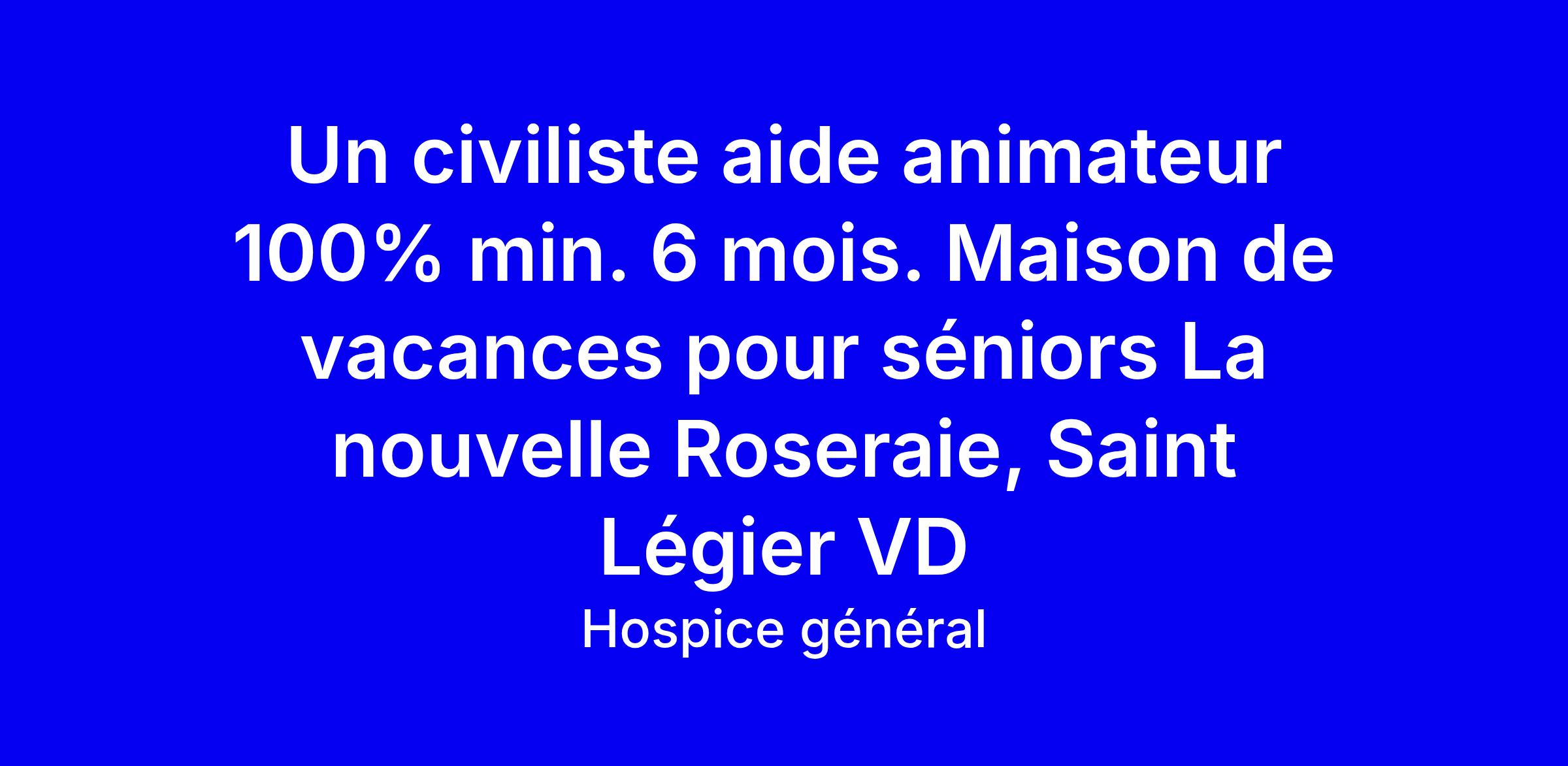 Ce poste d’aide animateur à 100% à la Nouvelle Roseraie de Saint-Légier est une opportunité pour assister l’animateur socioculturel, participer à l’élaboration du programme hebdomadaire et mettre en œuvre les activités tout en co-encadrant les résidents; vous favoriserez leur vie sociale, achèterez et entretiendrez le matériel, et assurerez des transports; vous conduirez le bus 9 places sur demande. Le profil recherché allie autonomie, adaptabilité et aisance rédactionnelle en français; compétences informatiques (Word, Excel) et expérience avec les personnes âgées sont des atouts; permis de conduire obligatoire. Contrat de 6 mois minimum, entrée à convenir; démarches civilistes préalables indispensables. Postulez en démontrant votre sens relationnel et votre esprit d’équipe.