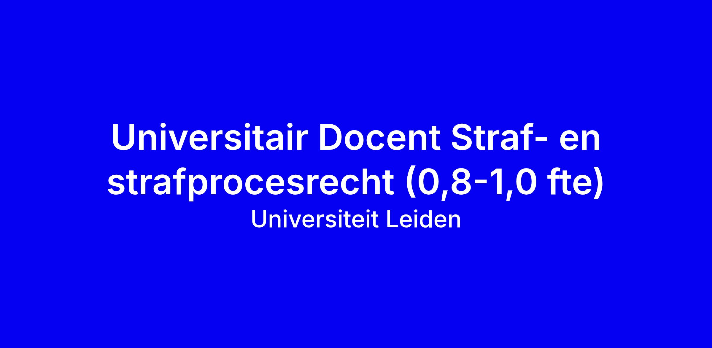 Universiteit Leiden zoekt een Universitair Docent Straf- en strafprocesrecht (0,8-1,0 fte) met een start tussen 1 augustus en 1 september 2026. De eerste aanstelling is voor een jaar en verloopt bij goed functioneren in vaste dienst. Je voert zelfstandig en in teamverband wetenschappelijk onderzoek uit en levert onderwijs aan de bachelor Rechtsgeleerdheid en aan de programma’s Cybersecurity en Cybercrime, alsook aan de masteropleidingen Straf- en Strafprocesrecht en Comparative Criminal Justice, inclusief begeleiding van scripties en (postdoctoraal) onderwijs. Je verworven of draagt bij aan externe financiering en levert een collegiale bijdrage aan de afdeling en het Instituut. Essentieel: een afgeronde juridische opleiding, promovatie op straf- of strafprocesrecht, brede vakkennis en sterke didactische kwaliteiten (BKO bij voorkeur), met de bereidheid tot professionele ontwikkeling en samenwerking. Solliciteren tot 16 maart 2026 via de gebruikelijke procedure, gericht aan prof. dr. J.W. Ouwerkerk; interne kandidaten hebben bij gelijke geschiktheid mogelijk voorrang.