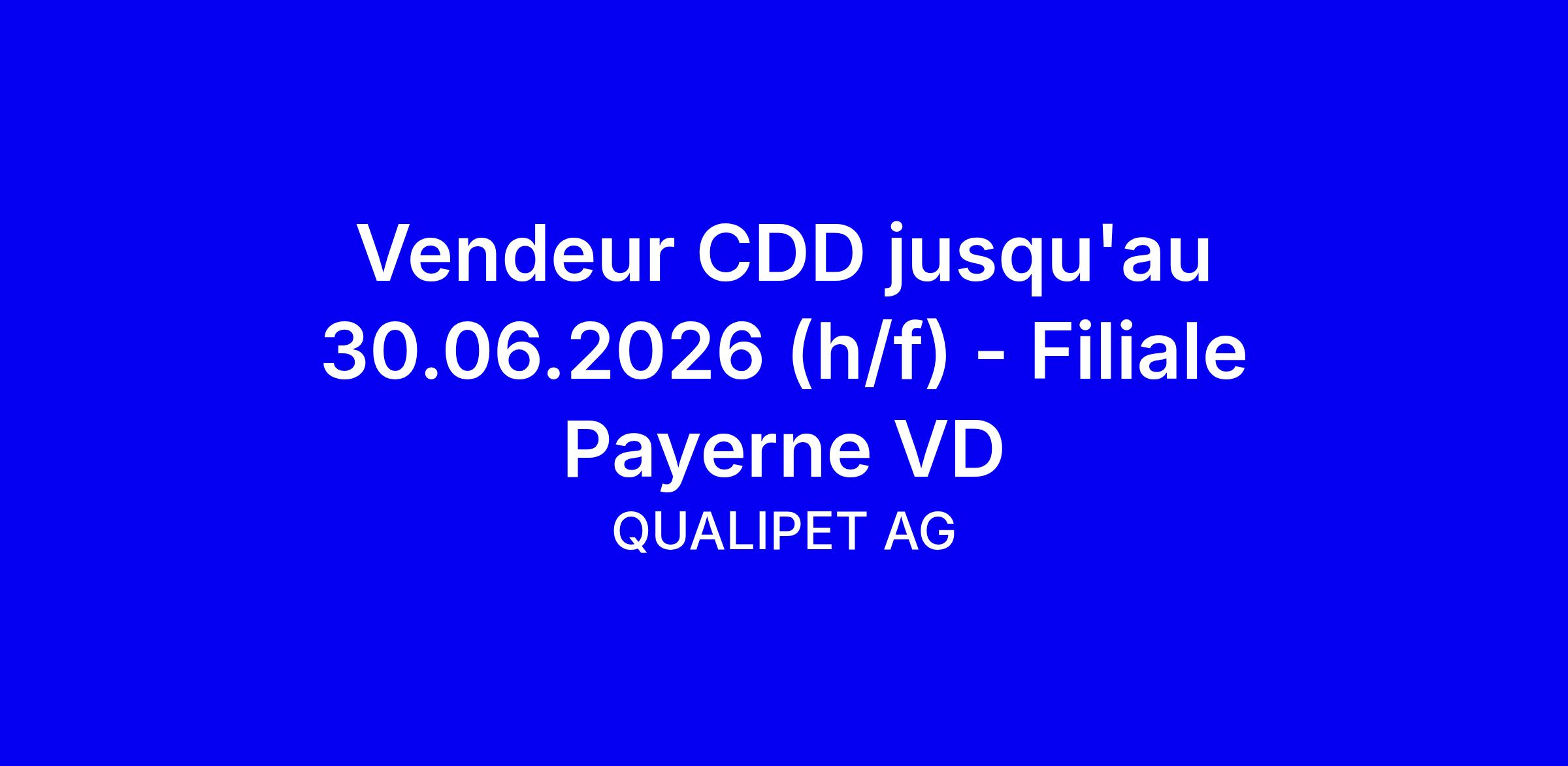 QUALIPET AG recherche un vendeur CDD jusqu’au 30 juin 2026 pour la filiale de Payerne VD, à 100% sur site. Vous travaillerez à la vente et au conseil, à l’encaissement, à la réception et au contrôle de marchandise, ainsi qu’à la gestion et la présentation des produits et à l’entretien des layouts. Le candidat idéal a une expérience en vente, une formation commerciale (idéalement dans la branche zoologique) et aime le contact client. Vous êtes ouvert, flexible et serviable et vous acceptez des horaires variables. L’offre prévoit un bonus, des formations internes et une atmosphère dynamique. Pour postuler, personnalisez votre CV et lettre en soulignant vos compétences en caisse, merchandising et votre passion pour les animaux, ainsi que votre disponibilité.