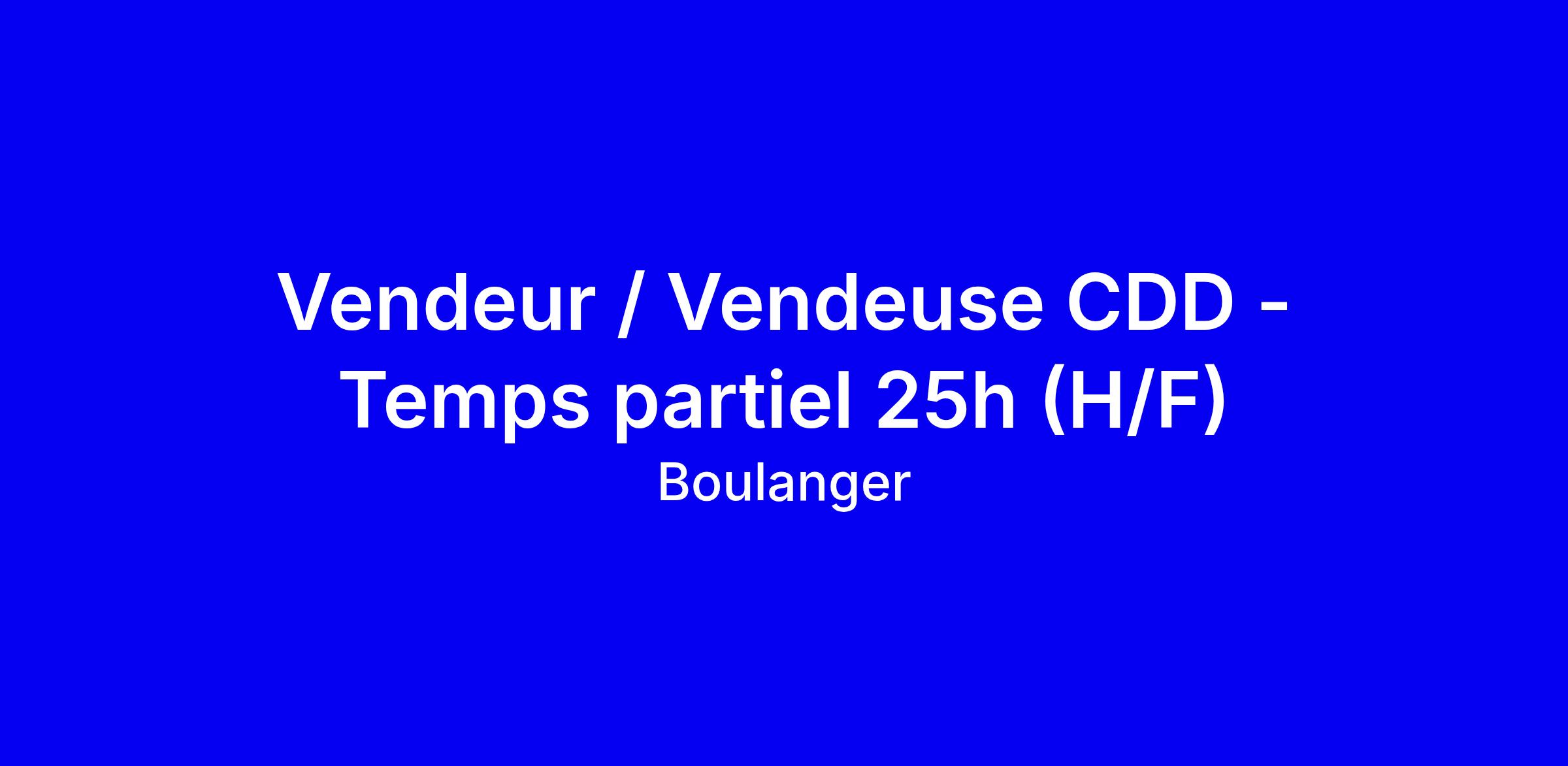 Offre de Vendeur / Vendeuse en CDD à temps partiel 25h chez Boulanger, vous êtes en première ligne du client, de la découverte du besoin à l’encaissement, avec une expérience complète et des rayons soignés. Notre singularité, c’est le client : une culture Pro, Simple et Sympa, axée sur l’engagement et l’innovation collective. Ce qui compte le plus: le sens du contact, l’envie d’aider le client et la curiosité pour progresser, tout en restant authentique. Conseils pour postuler : mettez en avant vos expériences de vente et de conseil, votre capacité à monter en gamme et à proposer des solutions, et votre appétit pour l’apprentissage. Rémunération fixe, variable, primes et avantages, dans un cadre inclusif et responsabilisant.