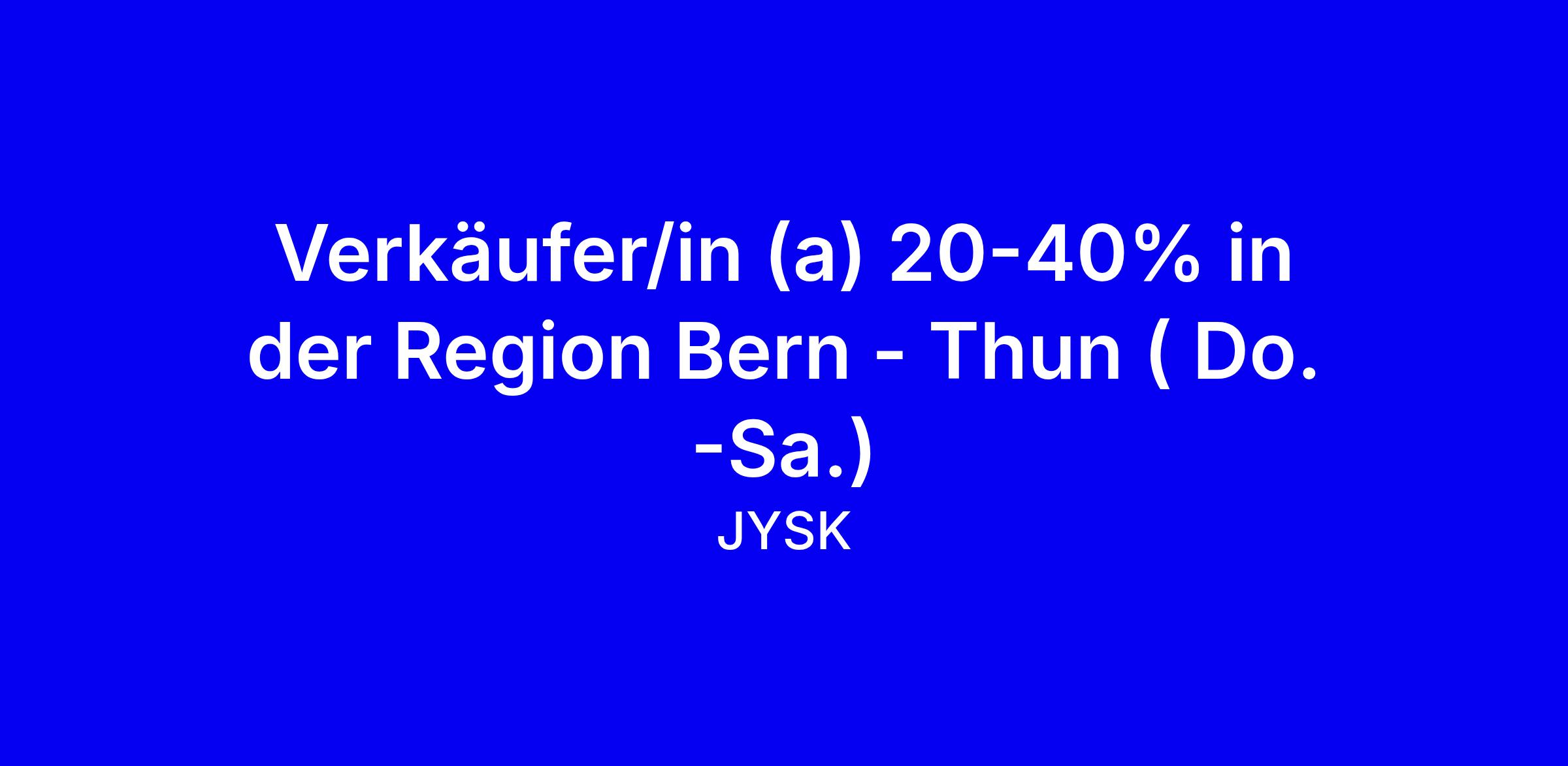 JYSK sucht eine Verkäuferin oder einen Verkäufer (20-40% Teilzeit) in der Region Bern - Thun, Do. bis Sa., onsite in Muri bei Bern. Du bist kontaktfreudig, bietest unseren Kundinnen und Kunden das beste Einkaufserlebnis, bist positiv, teamorientiert, hast eine Hands-On‑Mentalität und bist flexibel, auch samstags einsatzbereit. Zu deinen Aufgaben gehören Verkauf, Top-Service, Sauberkeit und Warenvorbereitung, sowie die Verantwortung für einen eigenen Bereich wie Matratzen oder Möbel. Wir bieten Entwicklungsmöglichkeiten, interne Wettbewerbe, Umsatzbonus, 20% Mitarbeiterrabatt, Top Pensionskassenleistungen, fünf Wochen Ferien (mit Steigerung), Versicherungen und Teamevents. Bewerbe dich heute und zeige konkrete Beispiele, wie du Verantwortung übernimmst und das Kundenerlebnis maximierst.