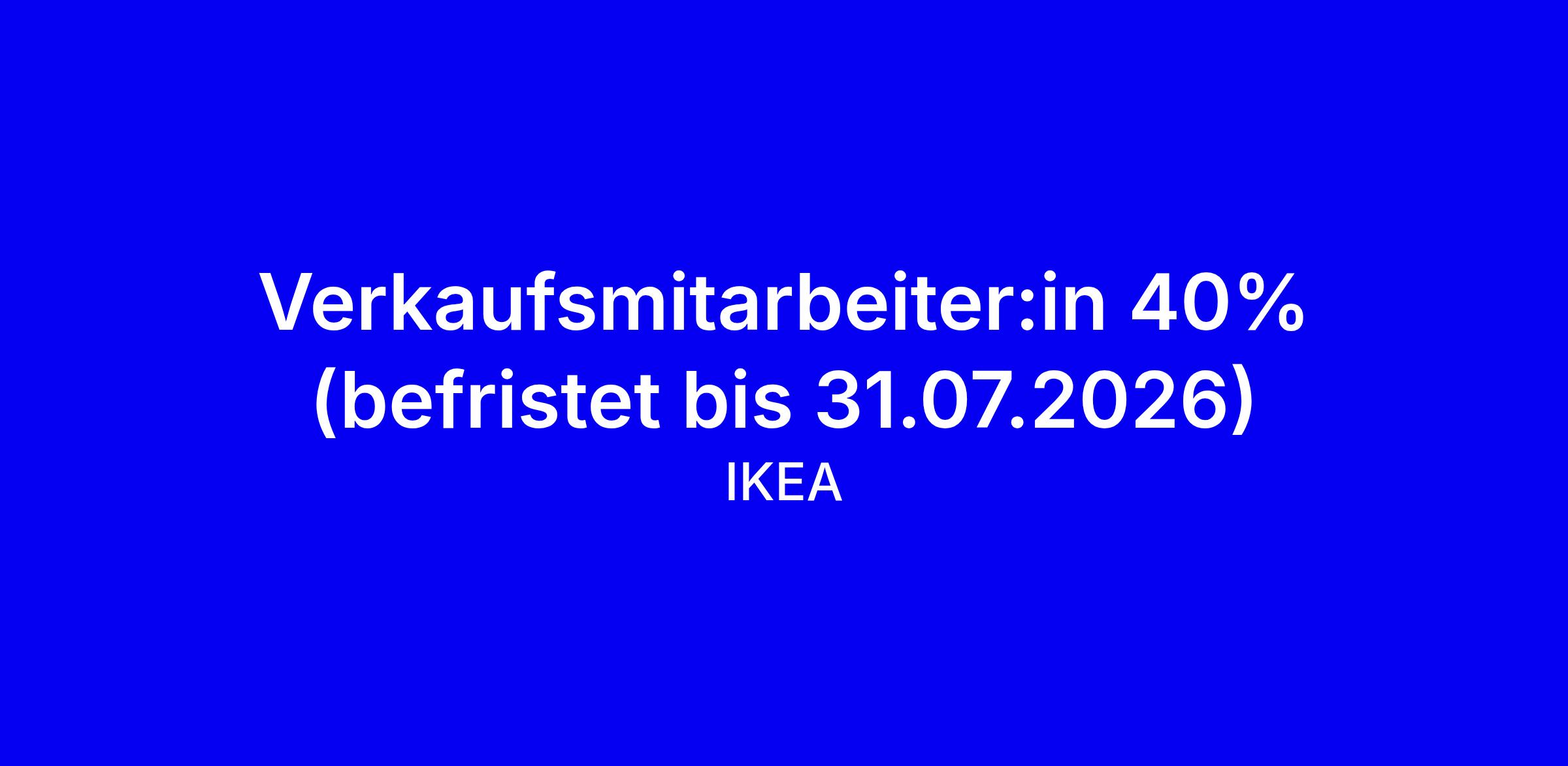 Die ausgeschriebene Stelle ist eine befristete Teilzeitposition (40%) im Verkauf in St. Gallen bis zum 31.07.2026, onsite bei IKEA. Sie arbeiten im Team, begrüßen Kunden, beraten zu Möbeln und Lösungen und tragen so zur Umsetzung der IKEA-Werte bei Vielfalt, Lernbereitschaft und Freude an der Arbeit bei. IKEA betont Nachhaltigkeit, Kundennähe und die Vision, vielen Menschen einen besseren Alltag zu schaffen. Worauf es ankommt: Begeisterung fürs Einrichten, Teamgeist, Serviceorientierung und Lernbereitschaft. Bewerben Sie sich mit konkreten Beispielen aus Kundendienst oder Verkauf, zeigen Sie, wie Sie zu unseren Werten passen, und passen Sie Ihre Bewerbung an den Standort St. Gallen an.