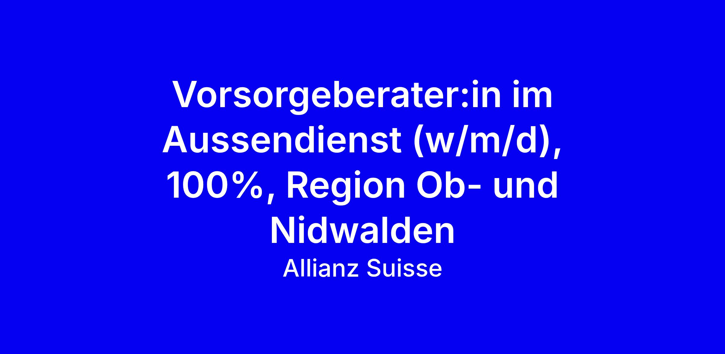 Als Vorsorgeberater:in im Aussendienst bei Allianz Suisse in der Generalagentur René Deck in Stans erwartet dich eine 100% Position im Ob- und Nidwalden. Du bist direkt im Kontakt mit Kundinnen und Kunden, berätst zu Vorsorge- und Anlageprodukten, arbeitest eigenverantwortlich und gestaltest Marktbearbeitung aktiv mit. Das Unternehmen bietet eine gründliche Einarbeitung, vielfältige Weiterbildung, ein leistungsorientiertes Vergütungsmodell mit realistischen Zielvorgaben, abwechslungsreiche Aufgaben und viel Flexibilität sowie den Rücken eines globalen Players mit starker regionaler Verankerung. Tipp: Betonen Sie Ihre Vorsorgekompetenz und regionale Kontakte. Voraussetzungen: eine höhere Ausbildung im Versicherungs- oder Finanzbereich, mehrjährige Berufserfahrung idealerweise mit Vorsorge-Schwerpunkt, Verkaufstalent, strukturierte und analytische Arbeitsweise, Freude am Umgang mit Menschen und gute Vernetzung in der Nähe der Agentur. Bewerbung Sebastian Kühn 058 357 58 71; Infos unter www.allianz.ch/aussendienst. Wir freuen uns auf dich.