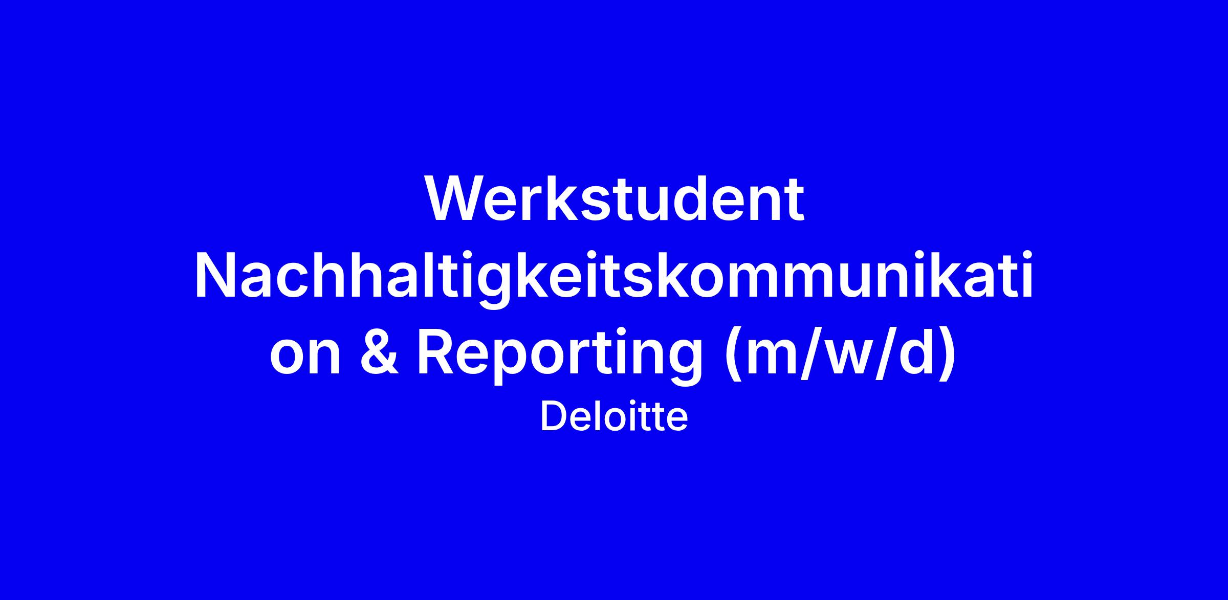 Du willst im Bereich Corporate Functions – Internal Sustainability dazu beitragen, ein nachhaltiges Arbeitsumfeld zu schaffen? Unser Team verantwortet bundesweit die Nachhaltigkeitsaktivitäten von Deloitte inkl. der dazugehörigen Berichterstattung und trägt zur Gestaltung und Umsetzung einer nachhaltigen Unternehmensstruktur bei. Sichere unseren gemeinsamen Erfolg und mach mit uns den Unterschied: als Werkstudent Nachhaltigkeitskommunikation & Reporting (m/w/d).