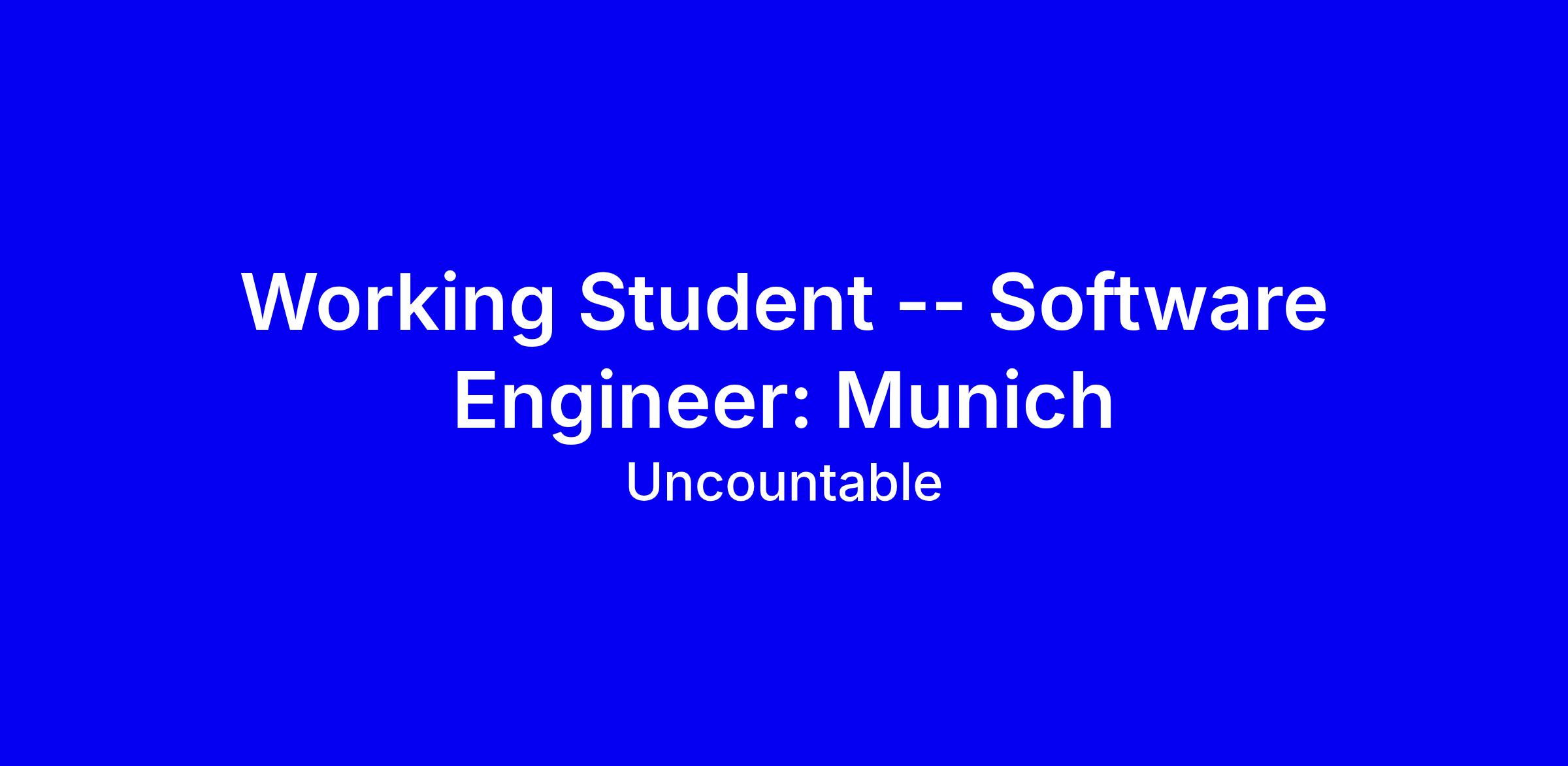 DescriptionUncountable is hiring working students in our Munich office. Our goal is to revolutionize scientific research and development, and we're looking for motivated students who can help us develop functionality, analyze data, and support the most innovative materials companies in Europe. Our office is located in downtown Munich. You will work with a collaborative team of experienced software engineers and scientific implementation managers, with the opportunity to learn from local Munich employees as well as our teams in San Francisco and New York.