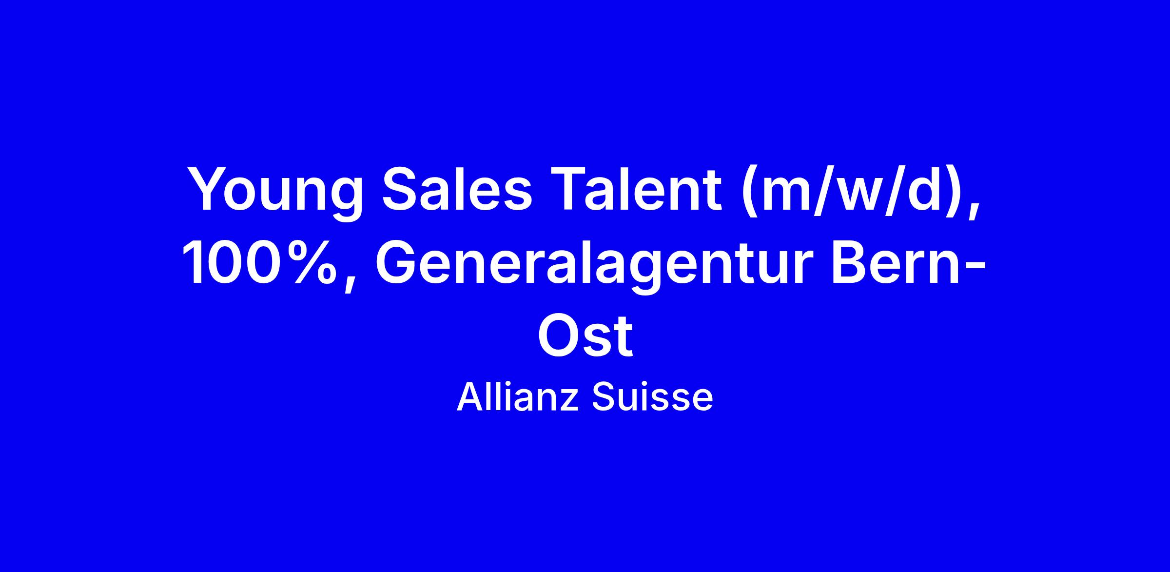 Allianz Suisse sucht mit dem Young Sales Talent Program (m/w/d) 100% in der Generalagentur Bern-Ost Worblaufen motivierte Nachwuchsverkäuferinnen und Verkäufer. Nach deiner abgeschlossenen Lehre durchläufst du in sechs Monaten am Hauptsitz eine kompakte Grundausbildung zu Produkten, Systemen und Telefonie und erwirbst das VBV Zertifikat, bevor du als Kundenberater/in in Bern-Ost durchstartest. Du profitierst von einer sorgfältigen Einarbeitung, einer erstklassigen Grundausbildung und spannenden Entwicklungschancen, arbeitest täglich mit Kunden, persönlich und virtuell, und sammelst wertvolles Verkaufswissen. Bring mit: abgeschlossene Lehre, Freude an moderner Technik wie Videoberatung, zielorientierte Arbeitsweise, Drive, Veränderungsbereitschaft und Nähe zur Agentur. Bewerbung online, bei Fragen wende dich an Alexander Wälchli, Tel. 076 512 15 56; weitere Infos unter www.allianz.ch/aussendienst.